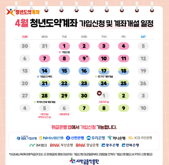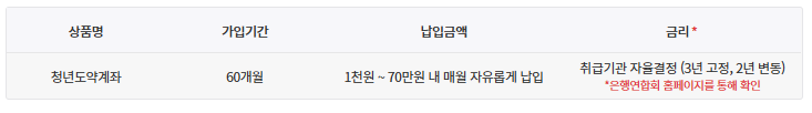 - 신청방법: 청년도약계좌 취급은행 앱을 통해 비대면 가입신청 및 계좌개설 가능 (영업일 9시 ~ 18시 30분)