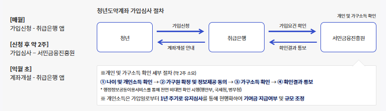 매달 초 신청 ☞ 세부일정은 서민금융진흥원 홈페이지(https://www.kinfa.or.kr) 공지사항 및 청년도약계좌 홈페이지(https://ylaccount.kinfa.or.kr) 안내