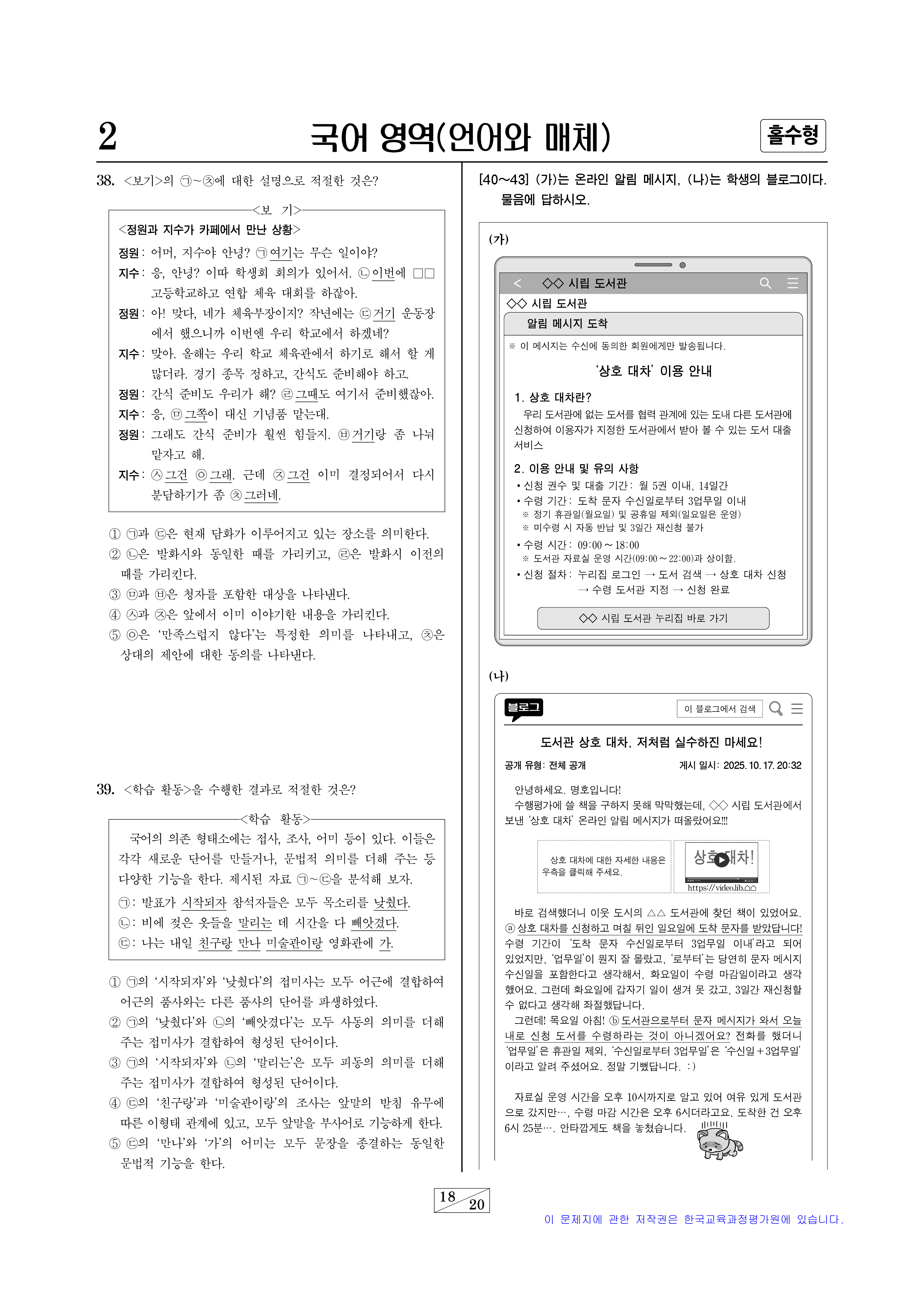 - 독서: 정보량 많은 과학·인문 복합 지문, 논리력 중심 평가