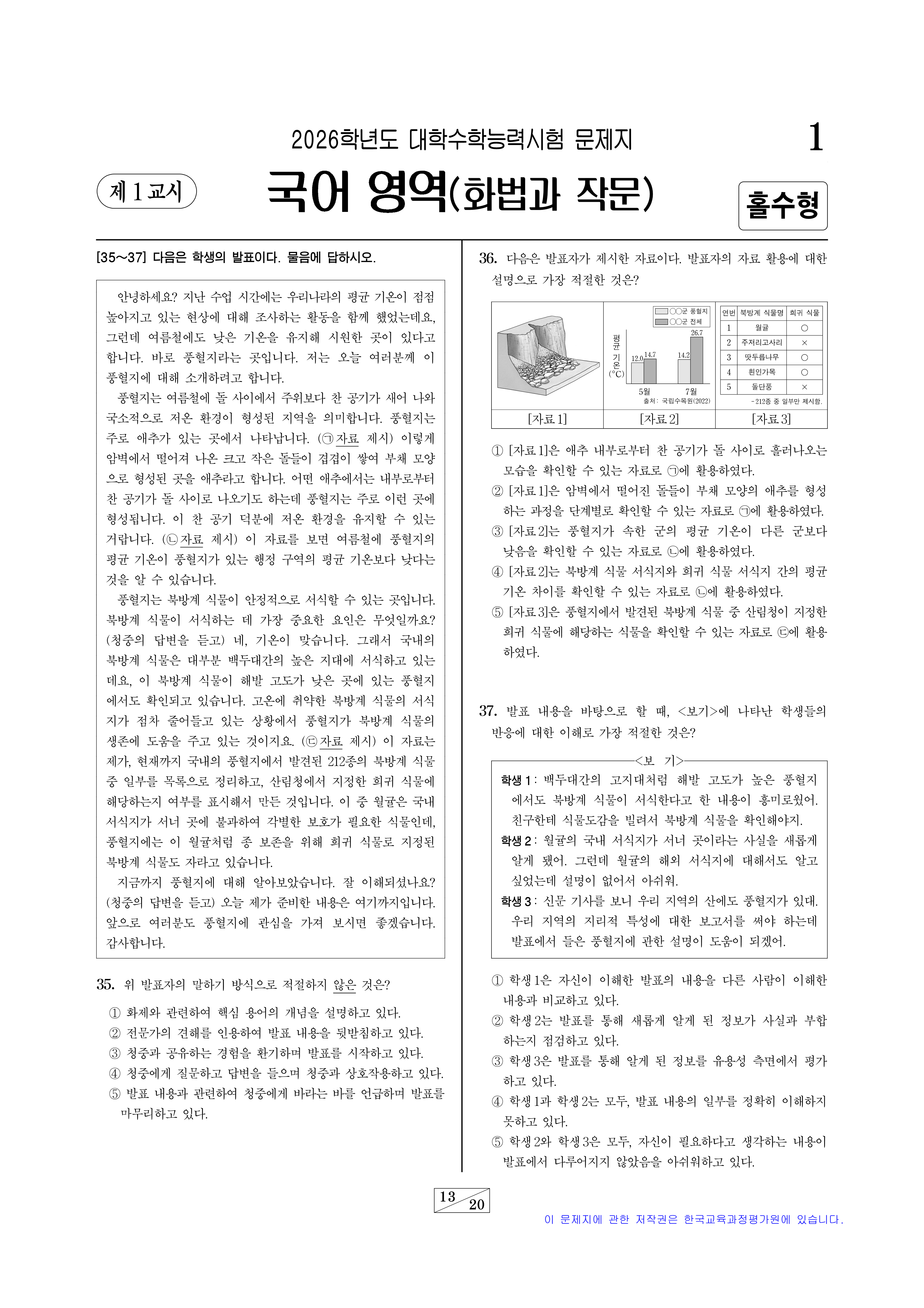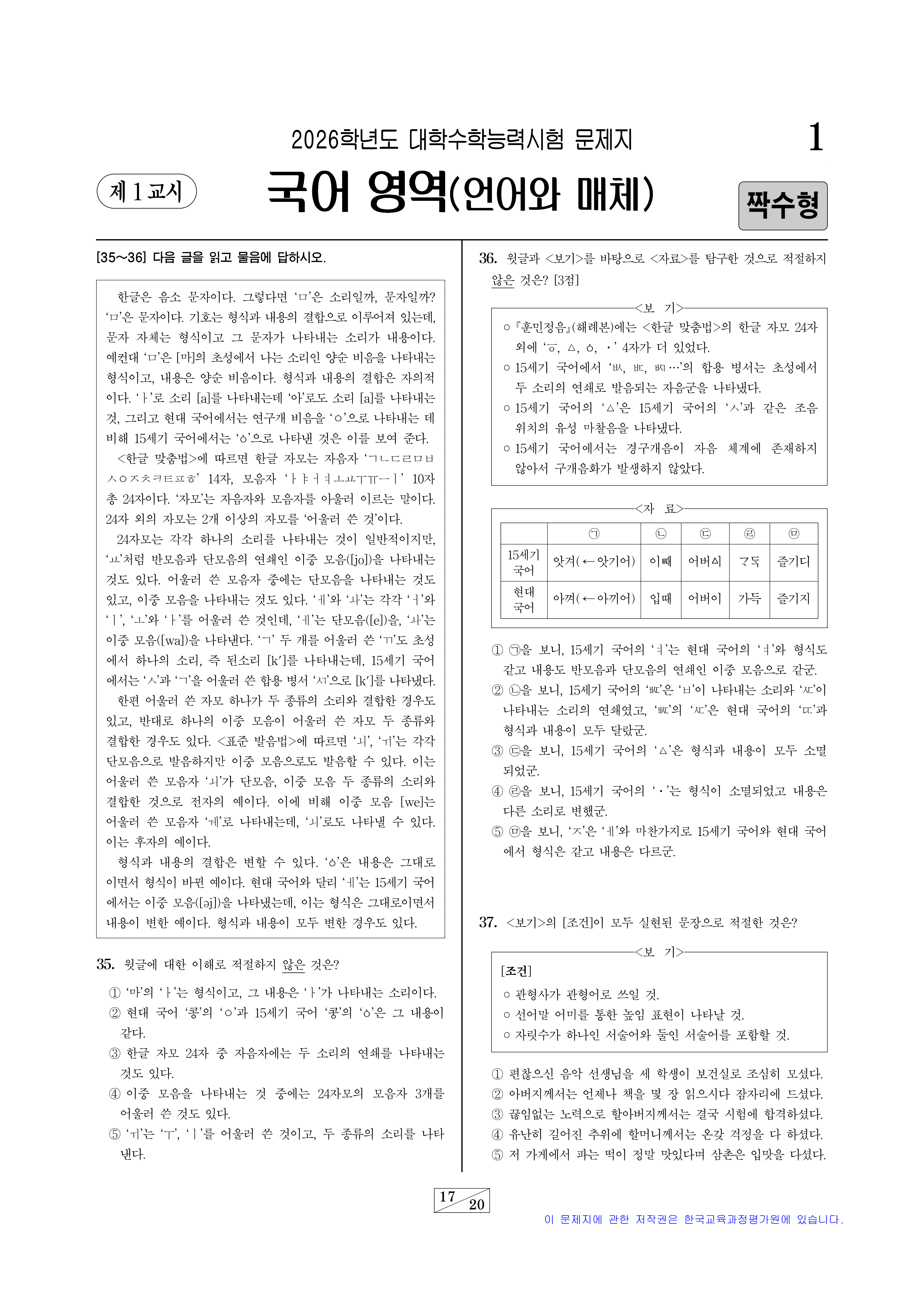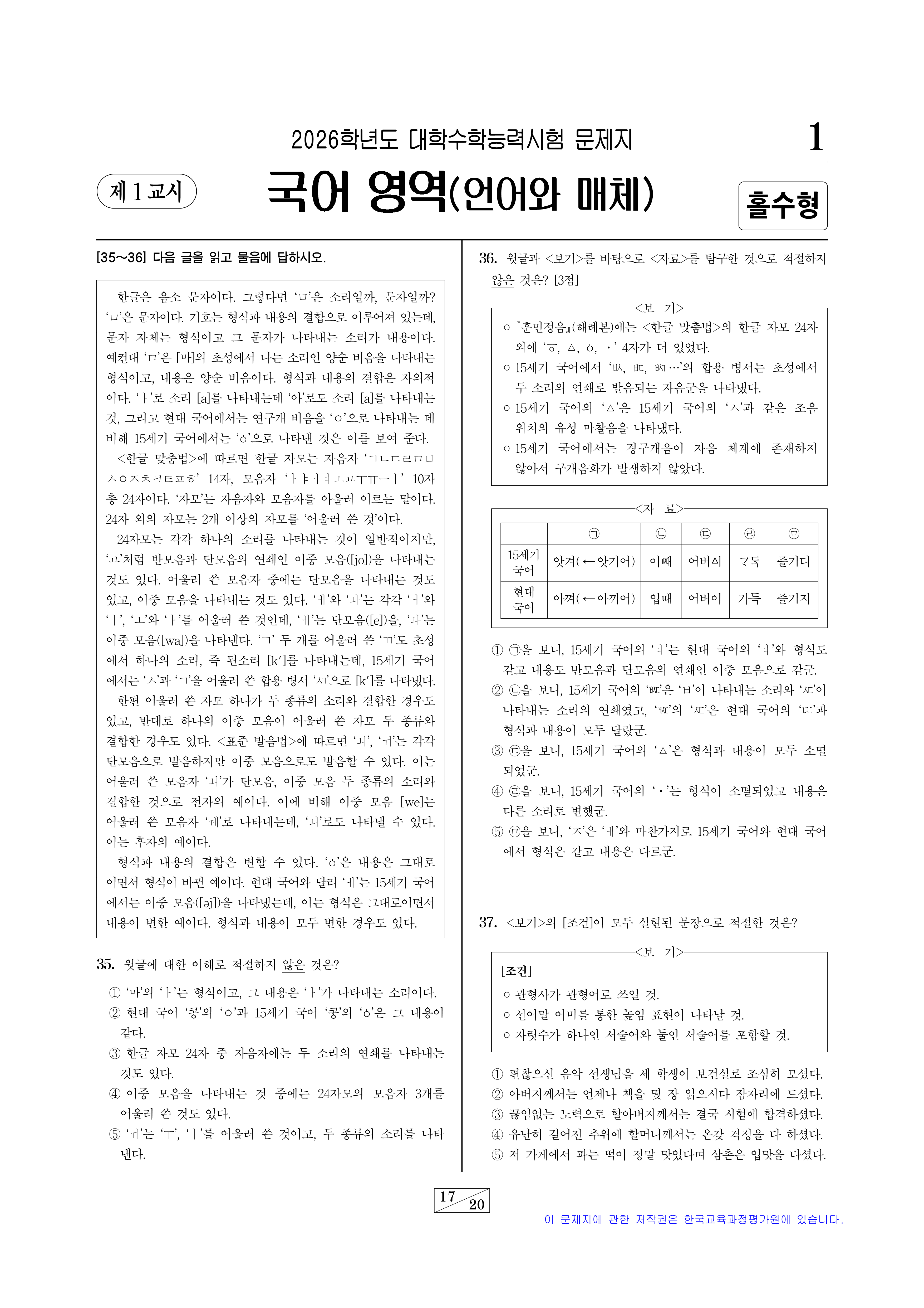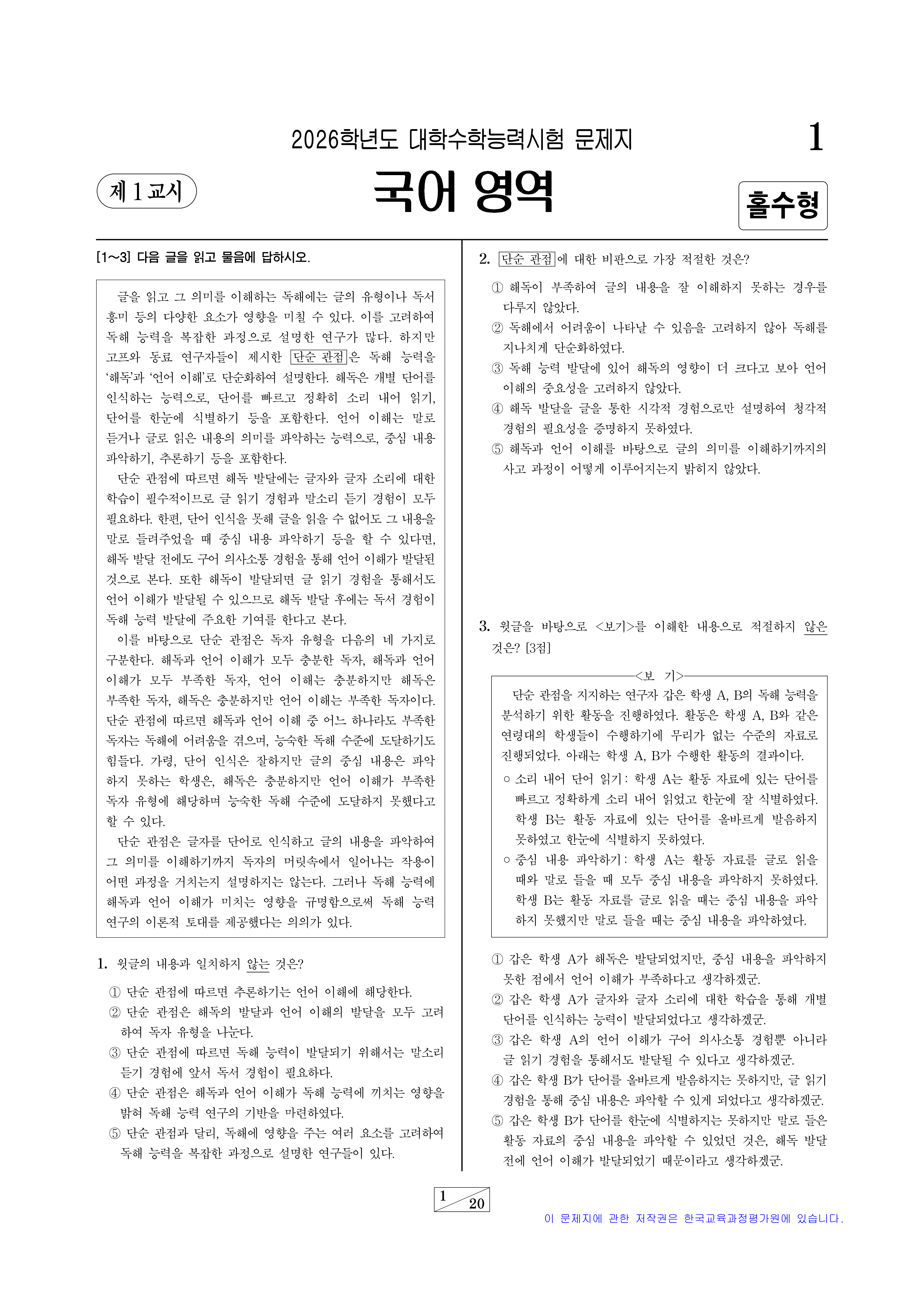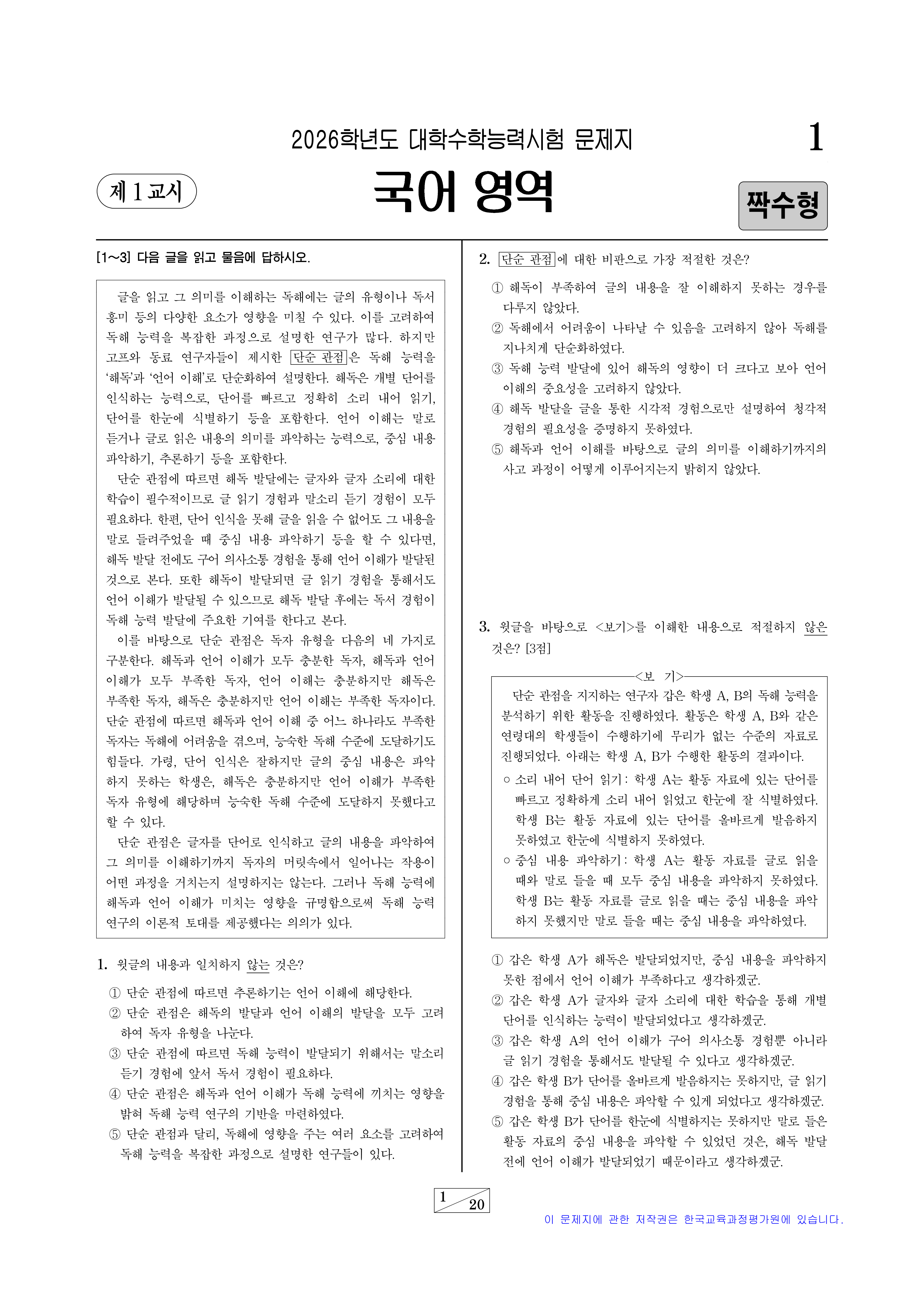 2025년 11월 13일에 시행된 2026학년도 대학수학능력시험 국어 영역.